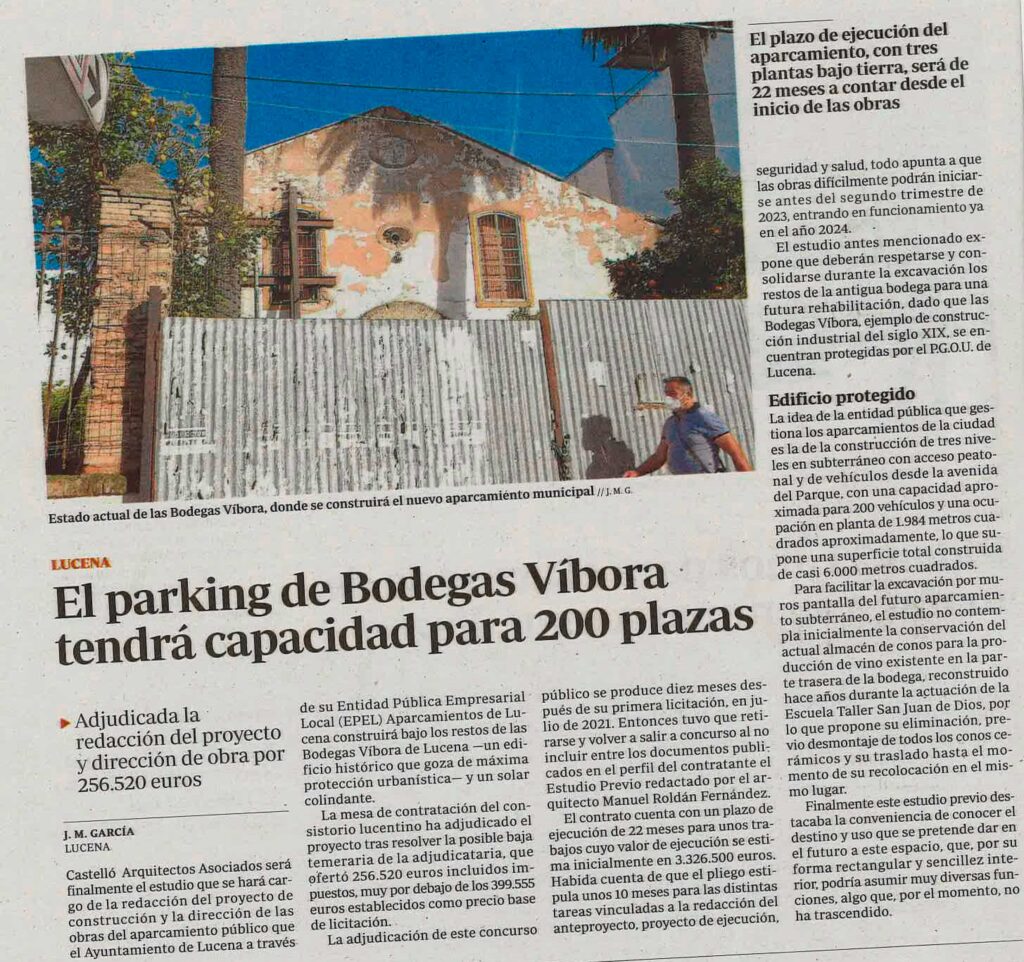 Castelló Arquitectos Asociados será finalmente el estudio que se hará cargo de la redacción de proyecto de construcción y la dirección de las obras del aparcamiento publico que el Ayuntamiento de Lucena a través de su Entidad Pública Empresarial Local (EPEL) Aparcamientos de Lucena construirá bajo los restos de las Bodegas Víbora de Lucena –un edificio histórico que goza de máxima protección urbanística– y un solar colindante.