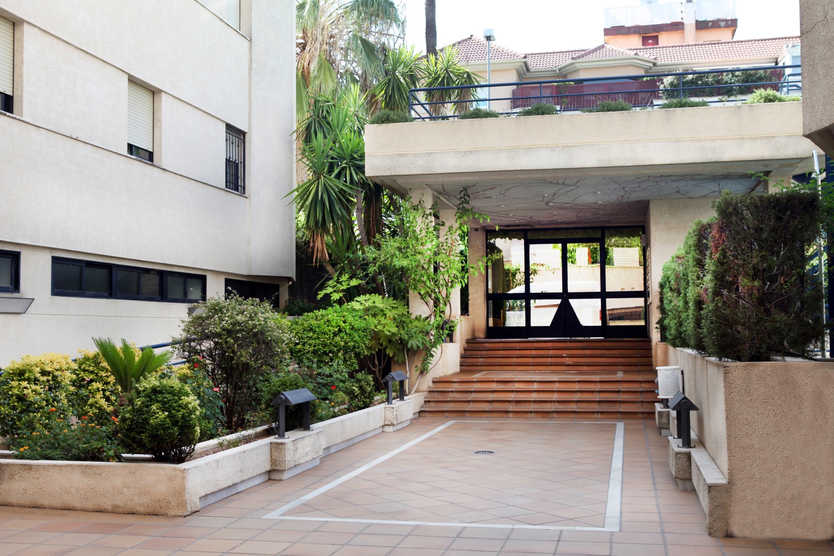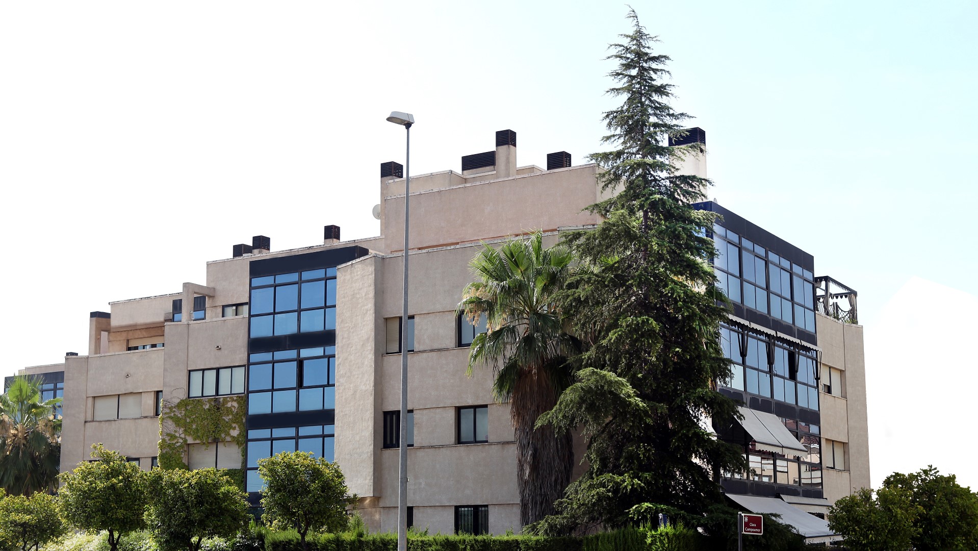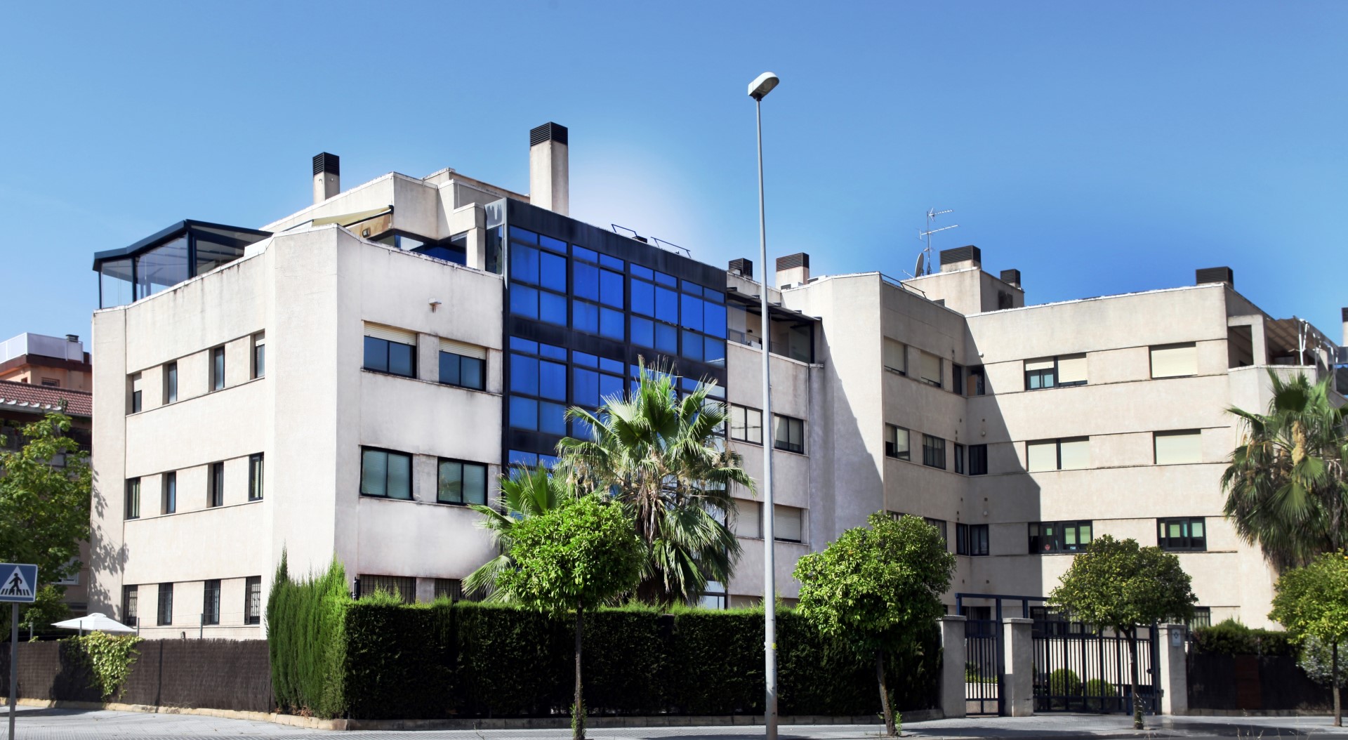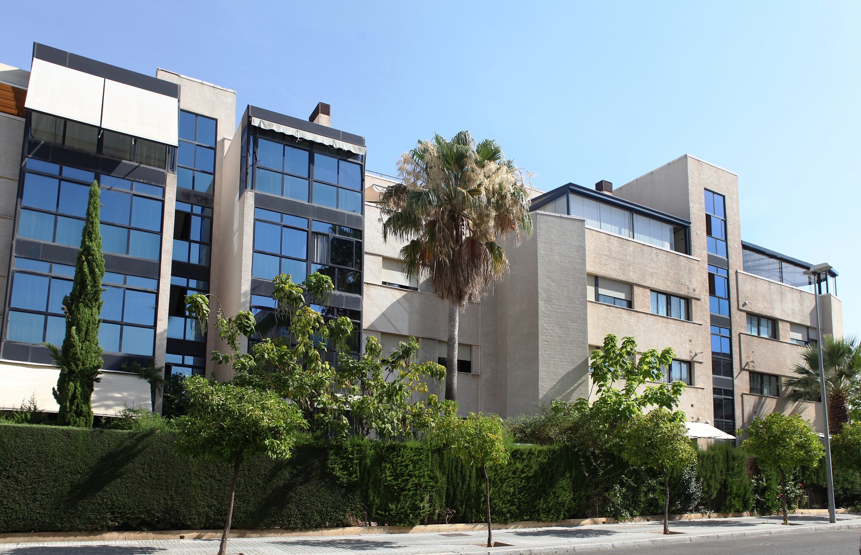 Conjunto residencial situado en zona privilegiada de la ciudad, con estupendas vistas a la Sierra. Coincide con la última línea de bloques plurifamiliares antes de los chalets aislados. Esto propicia que la orientación y las vistas no se puedan cercenar por ningún planeamiento. Precisamente es esta circunstancia la que sirve de directriz proyectual. En efecto, se intenta captar la máxima luz y vistas mediante grandes y potentes ventanales con vidrio cool-lite, coincidentes siempre con los salones.
