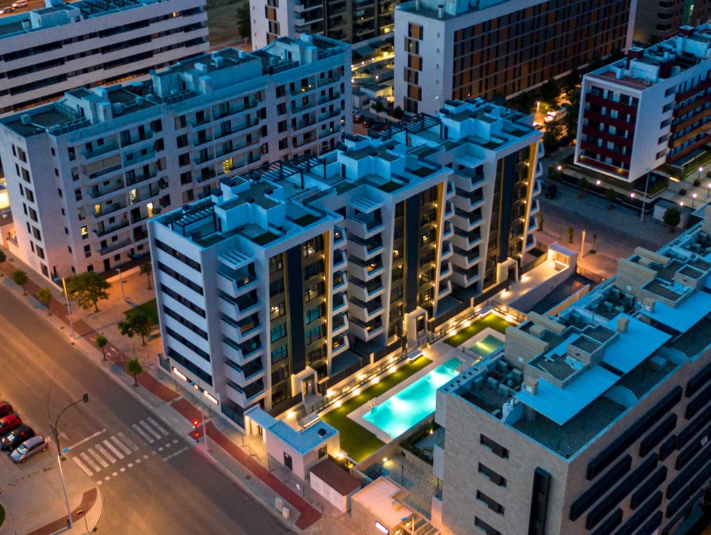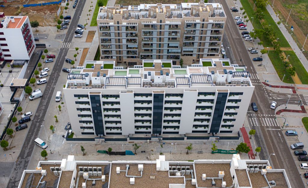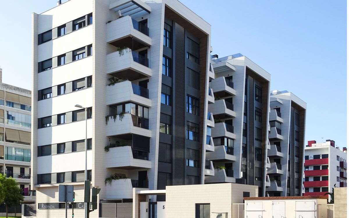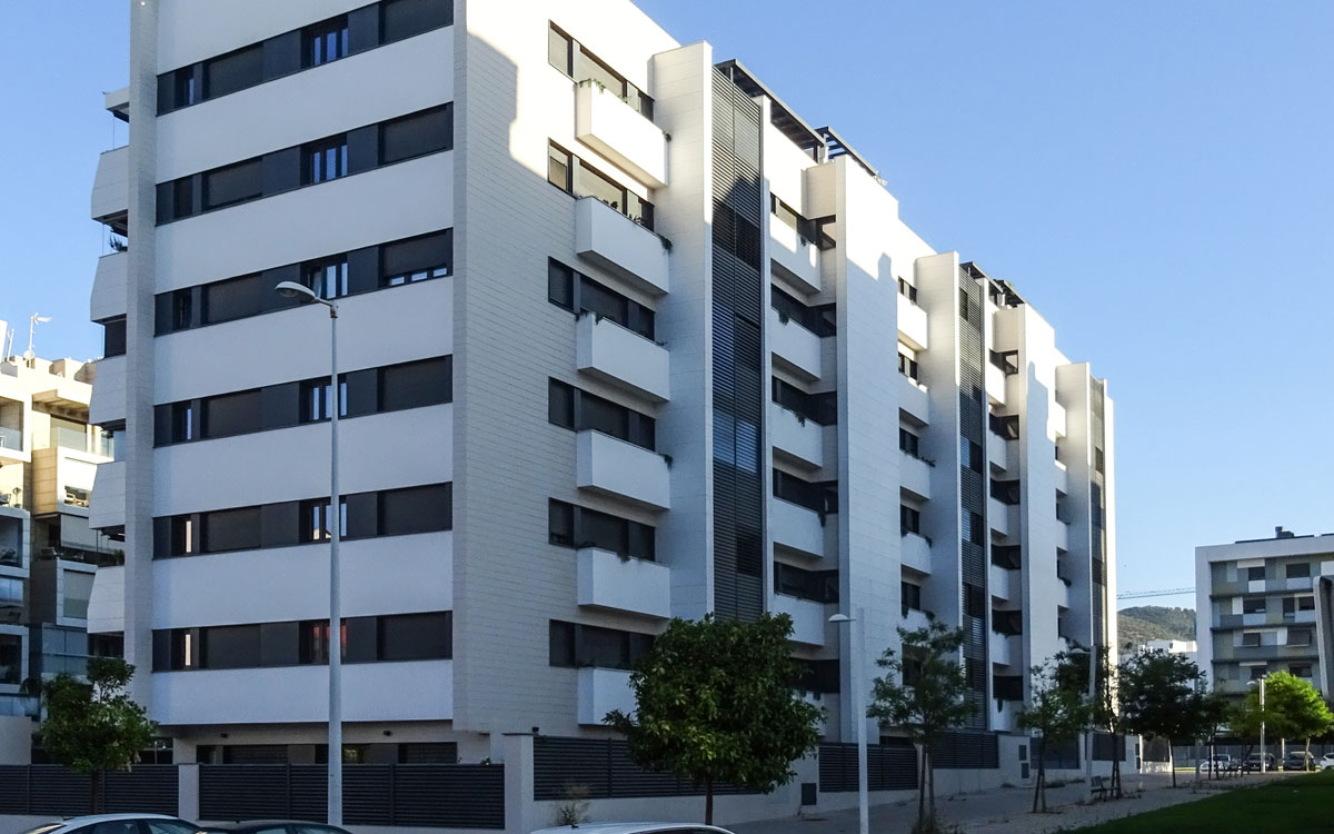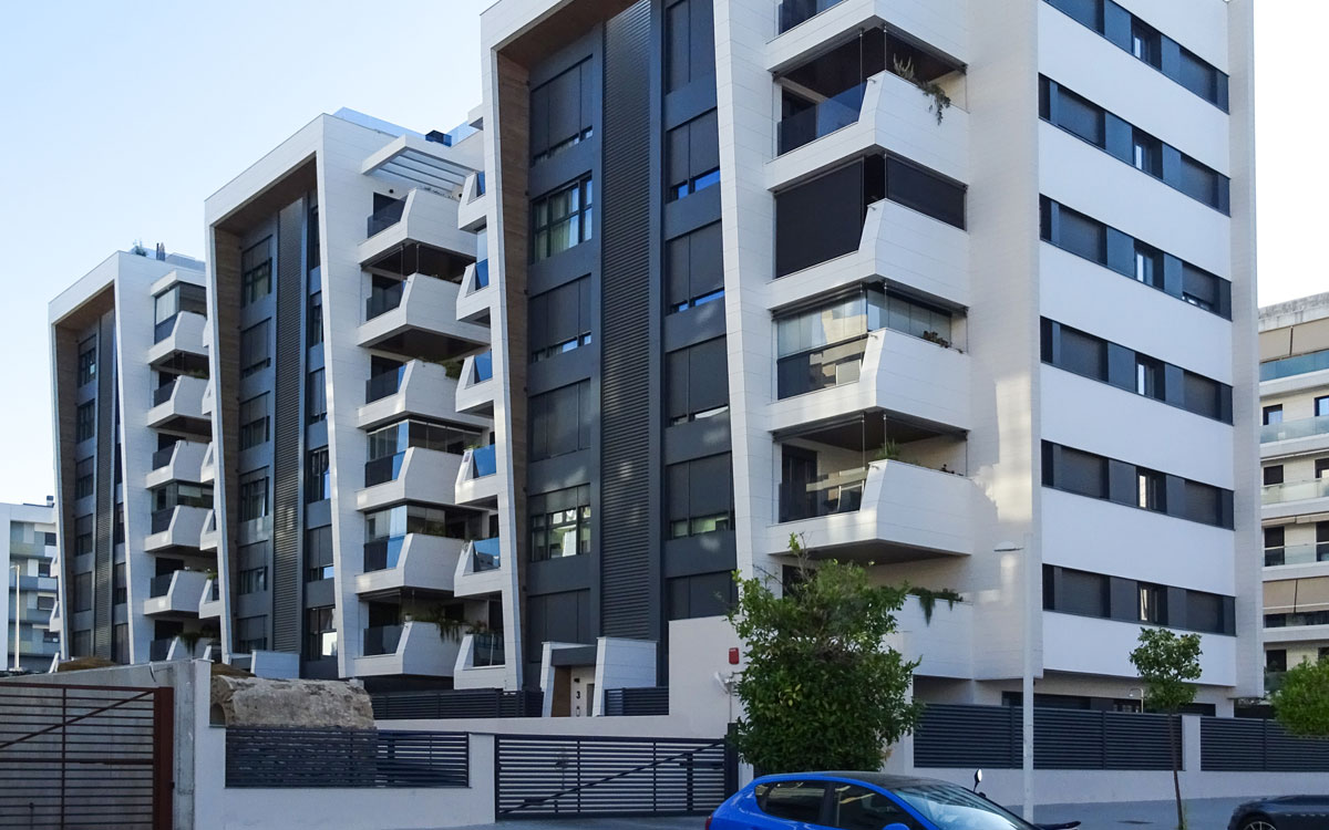 El proyecto se distingue por su fachada inclinada de carácter marcadamente contemporáneo, que articula la expresión arquitectónica del edificio con una geometría singular capaz de enriquecer el frente urbano del sector. Esta envolvente no solo introduce un gesto formal rotundo —que define la identidad del edificio dentro del tejido residencial— sino que también responde a criterios funcionales y ambientales, modulando la incidencia de la luz y favoreciendo la protección solar en espacios de vivienda y circulación.