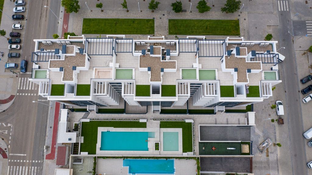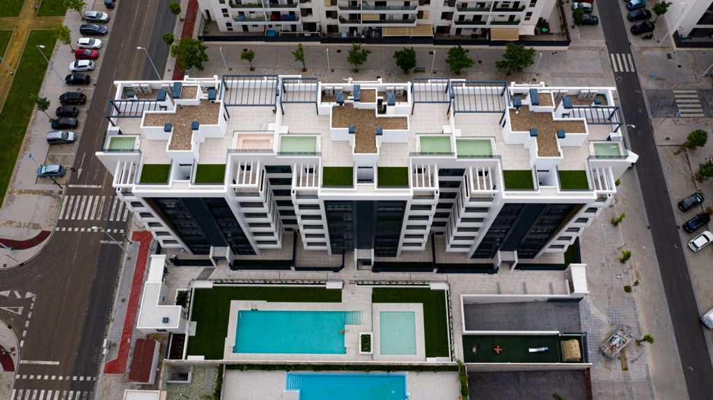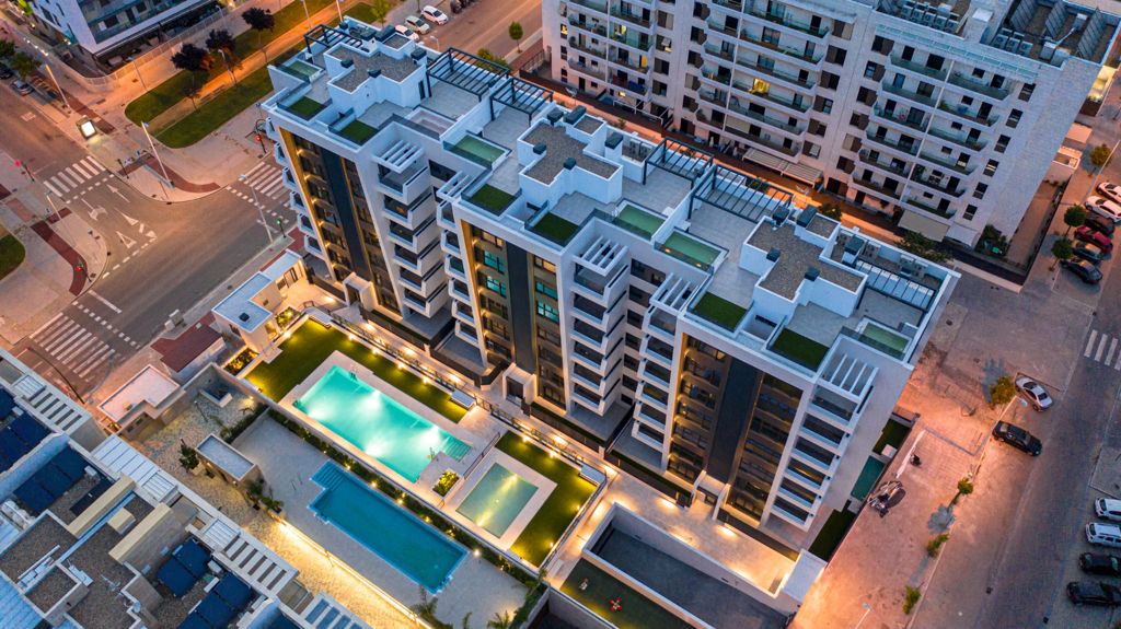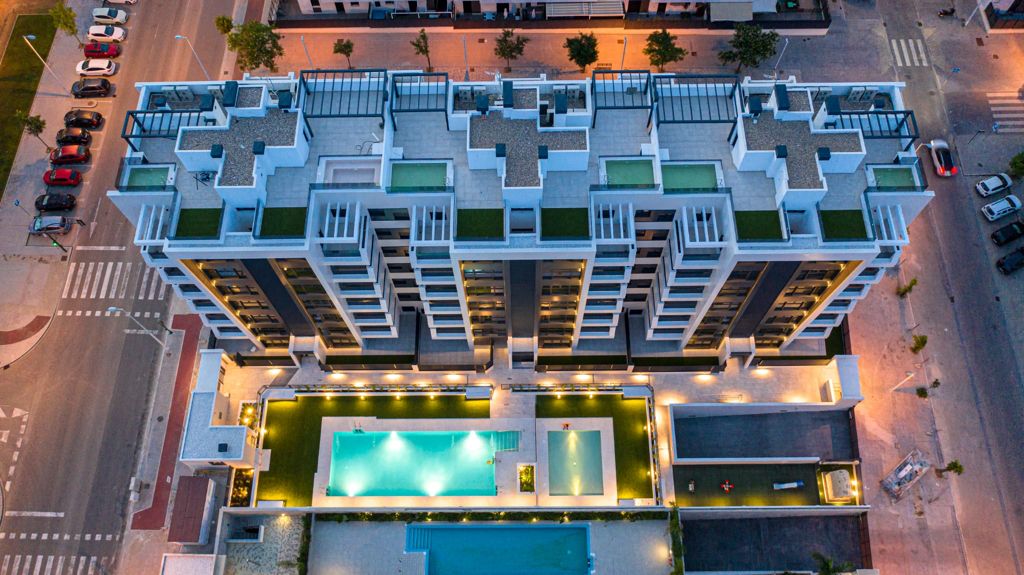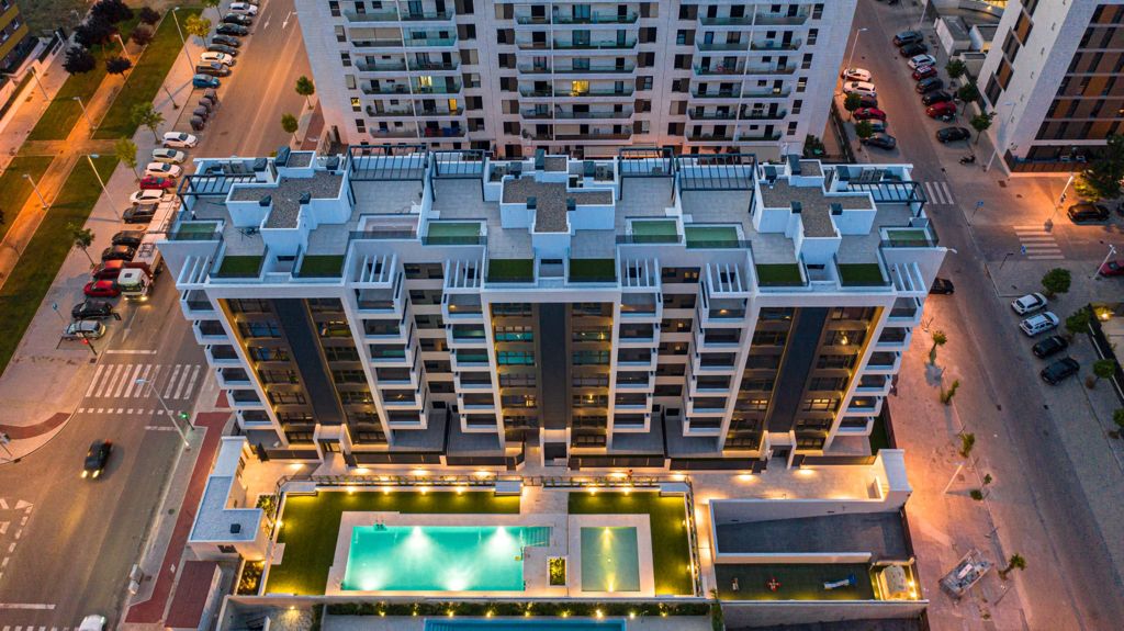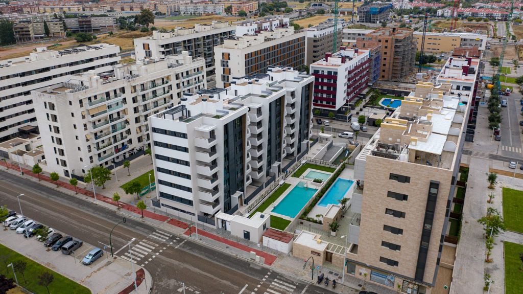 El proyecto se distingue por su fachada inclinada de carácter marcadamente contemporáneo, que articula la expresión arquitectónica del edificio con una geometría singular capaz de enriquecer el frente urbano del sector. Esta envolvente no solo introduce un gesto formal rotundo —que define la identidad del edificio dentro del tejido residencial— sino que también responde a criterios funcionales y ambientales, modulando la incidencia de la luz y favoreciendo la protección solar en espacios de vivienda y circulación.