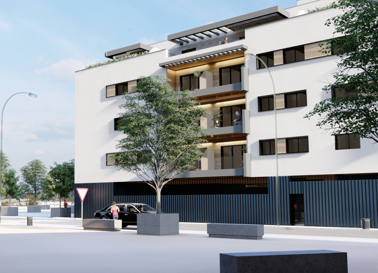 La fachada se compone con un lenguaje sobrio y ordenado, en el que la modulación de huecos y la combinación de materiales aportan ritmo y profundidad, mientras que los elementos de protección solar y balcones otorgan dinamismo y responden a criterios de habitabilidad y eficiencia energética. La luz natural, la ventilación cruzada y la orientación se convierten en protagonistas del diseño, asegurando viviendas confortables y espaciosas.